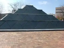 The sitework used stone to mimic a pyramid in the shape of a diamond. They added water so this artwork can be used as a fountain. It sits on IUPUI's campus along New York St with the pathways surrounding made out of brick. According to IUPUI's website, the artwork "is 100 feet long on each of its four sides." There are four levels to the piece with nine slight indentations along each siding. In addition, there are triangles that have been sculpted in to the stone so that water will come down to the base. On the proper front, there is a bronze memorial plaque at the bottom. It reads: