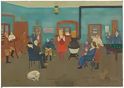 Gaylor was born in Stamford, Connecticut, on October 7, 1883. His birth name was Samuel Wood Gaylor, Jr.[49] His parents were Samuel Wood Gaylor, Sr. (born 1853), and Margaret Cecilia (McLean) Gaylor (born 1858).[5][7] Gaylor's father ran a sequence of saloons, inns, and rooming houses along the Connecticut shore and in Manhattan.[6][7][50][51] Gaylor had a sister, Mabel (born about 1886).[52] "Steven's Point" (shown at left) depicts himself with his father, mother, and sister in a shoreline barroom of a hotel that his father managed in 1888. Painted in 1929, it shows Gaylor holding a duck by its feet. He stands to the left of his mother. Mabel is standing on her right. His father stands behind the bar at far left. The viewer seems to be placed in an open doorway with a floor mat at his or her feet and there is water on the floor that, together with the hot stove in the center of the room, suggests cold and wet weather. At that time, Steven’s Point was a lonely maritime outpost on the Connecticut panhandle near Darien.[6] By the time he was 16, Gaylor's family had moved to Manhattan. He had left school and was working as an office boy while living at home.[7]
