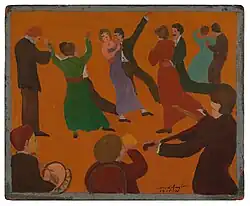 Gaylor had two paintings accepted for exhibition at the 1913 Armory Show which Kuhn had helped to organize.[10] Both were said to be impressionist in style.[6] In 1915, he painted an abstract work (shown at right) and became a member of the short-lived Cooperative Mural Workshop run by Katherine Dreier and her sister Dorothea. When he participated in a group exhibition held by the group that year (and possibly showed that painting), a critic described the works on view as "brilliant and vivid" in color and "simple and direct" in design.[11] The next year, in February, the Thumb Box Gallery gave him a solo exhibition and he participated in a group exhibition at the Montross Galleries.[12][13] Calling the solo exhibition "exceedingly interesting", a critic for American Art News said the carved and painted wood panels he showed were "exceptionally good in color and design" and noted that Gaylor "utilizes humans for designs in an amazing way".[14] In reviewing the group show, a critic described the painting called "Dawn" that Gaylor contributed as "well designed, but with terra cotta colored and non-modeled figures of a father and mother whose child is darker than they are."[13] The painting, "Social Dance" of 1915-16 (shown at right) may have been included in this exhibit. In October 1916, he showed works in a group exhibition at Montross Galleries organized by the New York Society of Etchers.[15] In 1917, Gaylor joined Kuhn and others in a short-lived group called the Penguin Club which, like the Armory Show, aimed to provide support for artists who rejected the conservative aesthetics of the National Academy.[2] In March of that year, he participated in one of the first exhibitions held by the club.[16] A critic described the drypoints, aquatints, and etchings that he showed as "interesting" with disconcerting color effects. The critic also said Gaylor's carved wood panels showed good drawing and striking coloring.[17]