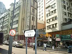 Wood Road (Chinese: 活道) is an L-shaped road in the Wan Chai district of Hong Kong Island. It connects Wan Chai Road in the northeast, opposite to C C Wu Building and Oriental 188 Shopping Centre, and Queen's Road East in the southwest, between the Tung Wah Centenary Plaza Garden and St. Joseph's Primary School. There is a staircase at the end of Wood Road and vehicles cannot drive directly from Wood Road to Queen's Road East. Wood Road is not a main road for traffic, but as there are two primary schools, two secondary schools and the Morrison Hill campus of the Hong Kong Institute of Vocational Education in the area, a large number of students use the road on daily basis.