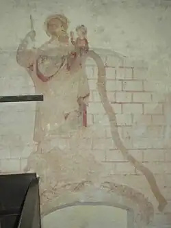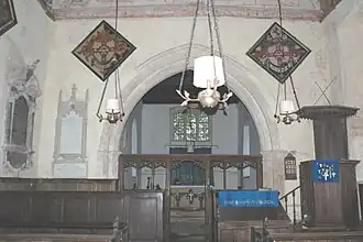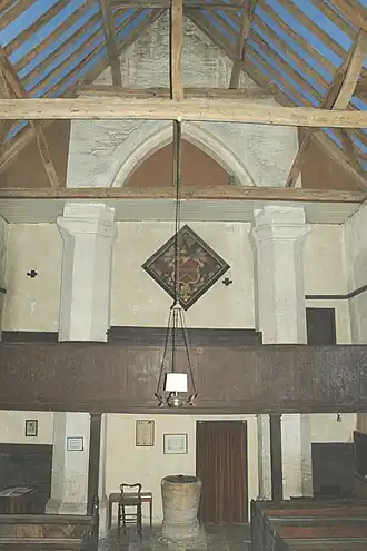 In the 14th century a large image of Saint Christopher was painted on the north wall inside the nave.[22] Restoration work in 2010 exposed remnants of an early 14th-century crucifixion scene above the rood beam over the chancel arch.[23] Both the chancel and the nave have pews with 15th-century carved wooden bench ends.[6] The wooden screen in the chancel arch and some of the nave seating was added late in the 15th or early in the 16th century.[16] Reportedly there was a rood tympanum but this had been removed before 1846.[16] In the 18th century the wooden pulpit, tester and reading desk were added,[6] along with the wooden panelling and west gallery.[2] Some timbers from the chancel screen tympanum seem to have been re-used in the 18th-century reading desk and pew floors.[16] There is also one box pew at the front of the nave, presumably for the manorial family.