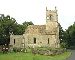 Several Early English lancet windows in the chancel also date from this period. The nave was rebuilt in about 1250–1300.[16] Later in the Middle Ages, the east and south walls of the chancel were rebuilt and were given late Perpendicular Gothic windows.[16] The eastern window in the south wall of the nave was also revised with Perpendicular tracery.[16] The Perpendicular Gothic belltower was added in either the 14th[6][17] or 15th century.[2] Unusually the tower is built on columns erected inside the nave. This seems to be because the ground falls away west of the church to an extent that precluded building a tower conventionally to the west of the nave.[16] The south porch was built in the 18th century.[2] In 2010 the church roof was restored, re-using many of the original Stonesfield slates.[18] Holy Rood church is a Grade I listed building.[17]