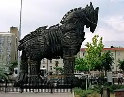 In Greek mythology, the Trojan Horse (Greek: δούρειος ίππος, romanized: doureios hippos, lit. 'wooden horse') was a wooden horse said to have been used by the Greeks during the Trojan War to enter the city of Troy and win the war. The Trojan Horse is not mentioned in Homer's Iliad, with the poem ending before the war is concluded, and it is only briefly mentioned in the Odyssey. It is described at length in the Aeneid, in which Virgil recounts how, after a fruitless ten-year siege, the Greeks constructed a huge wooden horse at the behest of Odysseus, and hid a select force of men inside, including Odysseus himself. The Greeks pretended to sail away, and the Trojans pulled the horse into their city as a victory trophy. That night, the Greek force crept out of the horse and opened the gates for the rest of the Greek army, which had sailed back under the cover of darkness. The Greeks entered and destroyed the city, ending the war.