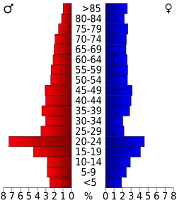In the county, the population was spread out, with 18.8% under the age of 18, 18.6% from 18 to 24, 22.3% from 25 to 44, 23.1% from 45 to 64, and 17.2% who were 65 years of age or older. The median age was 34.7 years. For every 100 females there were 114.8 males. For every 100 females age 18 and over, there were 109.9 males.