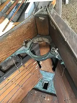 The spritsail boat's mast was let down by opening the mast partner, a bronze (or wooden) gate located in the breasthook or immediately behind the stem apron. Anecdotally, this design feature appeared because of the fixed bridges over the "gutters" connecting some of the minor embayments in Woods Hole and in the proximate Elizabeth Islands. The most cited example concerns the historic entrance from Great Harbor to Eel Pond in Woods Hole, where it was said that a fisherman could sail up to the fixed stone bridge, let down his mast, and use the boat's momentum to glide under the bridge.[16] The boats typically exhibited two rowing stations, with oars placed between thole pins attached to the coaming, allowing the helmsman or crew to stand facing forward while pushing the oars to propel the boat.[16]