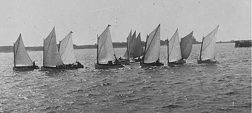 Upon its establishment in 1897, the Woods Hole Yacht Club adopted the spritsail boat as one of its main racing classes—eventually organizing it into two separate classes[28]—and spritsail boats were raced there until at least 1909.[19] Occasional races were sanctioned independently thereafter. Many of the races were said to have involved financial prizes and trophies.[11]