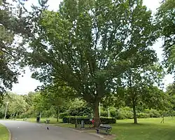 An oak tree (Quercus robur), known as the Peace Tree, was planted in the park on Empire Day 1919 to remember those killed during the First World War.[9][10] It became a focal point for veterans in the local area.[10] A similar tree was planted at the same time in Falls Park but died of natural causes. Discussions have taken place recently between local politicians with a view to replacing the tree.[9]