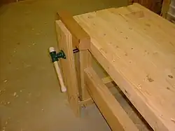 Relatively difficult to build and install Relatively fragile, unless constructed using dovetail or finger joints Unconstrained as to size and capacity It is theoretically possible to clamp workpieces which are as tall as the floor-to-ceiling distance, between the jaw and the apron |