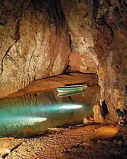 An artificial tunnel 180 metres (590 ft) leading off from the third chamber allows show cave visitors to cross the seventh and eighth chambers on bridges, and skirt around the ninth chamber on a walkway, before exiting near the resurgence.[7] A second excavated 74-metre-long (243 ft) tunnel from the ninth chamber allows visitors to visit the 20th chamber.[9][10]