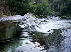 Wooley Creek is a large stream in Siskiyou County, California, a tributary of the Salmon River. Wooley Creek flows 22 miles (35 km)[1] from Man Eaten Lake[2] in the Marble Mountain Wilderness of the Klamath National Forest, in a generally southwest direction, to its confluence with the Salmon River about 4 miles (6.4 km) upstream of the Salmon's confluence with the Klamath River at Somes Bar.[3] The creek drains an isolated and rugged wilderness area – there are no paved roads and only a few permanent residents in its watershed. Lower Wooley Creek provides Class IV-V (very difficult) whitewater and is seldom run due to the lack of easy access.[4] The Wooley Creek Trail provides access along the creek into the wilderness area. It is one of the few major trails in the area suitable for year-round use due to its low elevation.[5]