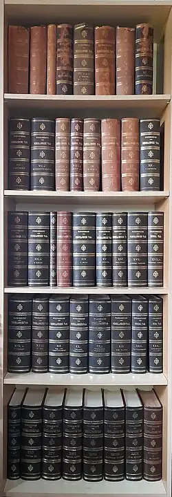 The Woordenboek der Nederlandsche Taal (WNT; lit. 'Dictionary of the Dutch language') is a dictionary of the Dutch language. It contains between 350,000 and 400,000 entries describing Dutch words from 1500 to 1976. The paper edition consists of 43 volumes (including three supplements) on 49,255 pages.[1] It is believed to be the largest dictionary in the world in number of pages.[2] The dictionary was nearly 150 years in the making from 1849; the first volume was published in 1864, and the final volume was presented to Albert II of Belgium and Beatrix of the Netherlands in 1998.