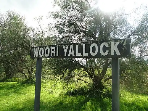 Woori Yallock was a railway station on the Warburton line in Melbourne, Australia. The station operated from 1901 until 1965 when the line was shut down. Today, only a retaining wall for the station platform and sign remain.[1]