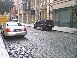 Wooster Street is a street in SoHo and Greenwich Village in Manhattan, which runs south to north from Canal Street to Washington Square.[1] It is a prime location for on-location filming and photo shoots due to its relatively low traffic, and the flagstone sidewalks and cobblestone street give it an old gritty feel. It is depicted as a night-time rainy street on the cover of the issue of The New Yorker dated February 8, 2021.