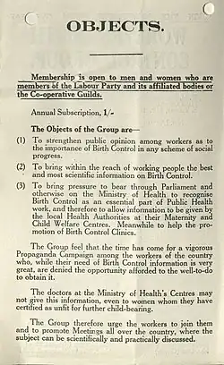 During the 1920s, a number of prominent women's groups began to speak out in favour of access to, and information about, birth control.[4] At the beginning of the decade, government restrictions were in place to prevent physicians at public health clinics from providing information on birth control, even to married women.[5] In 1922, a Miss E. S. Daniels had been dismissed from her post in a public health department for refusal to comply with these regulations.[5] In 1923, at the annual conference of the Women's Cooperative Guild, a resolution was passed in favour of calling for the alteration of these restrictions: making the WCG the first women's organisation to take up the issue of birth control.[5] Although a similar resolution was proposed by the women's conference of the Labour Party in the same year, it came late in proceedings, and it was decided that there was too little time to discuss it effectively.[5]