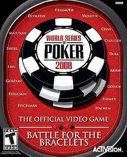 World Series of Poker 2008: Battle for the Bracelets is a video game based on the popular gambling tournament World Series of Poker. It is the sequel to World Series of Poker: Tournament of Champions and is available for the Xbox 360, PlayStation 2, PlayStation 3, PlayStation Portable, Nintendo DS and Microsoft Windows. There are many well-recognized professional poker players in this game, such as Scotty Nguyen, Phil Hellmuth, Chris Ferguson, and Johnny Chan.