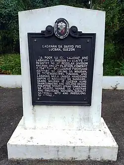 | Battle of Barrio Piis | Marker | Lucban, Quezon | 2010 | Marker commemorating the battle between units of the Philippine Army's 1st Regular Division, and the Japanese invading forces that landed in Mauban on December 26, 1941. | 14°51′14″N 120°28′26″E / 14.8539°N 120.4738°E |
