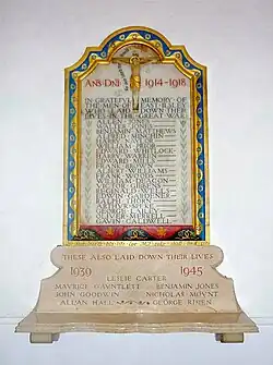 The deaths caused by World War I were difficult for post-war societies to cope with: their unprecedented scale challenged existing methods of grieving.[168] Furthermore, an expectation had arisen during the war that individual soldiers would expect to be commemorated, even if they were low ranking members of the military.[169] One method used to address this was the inclusion of lists of names. In part, this was a response to the practical problem of commemorating such large numbers of dead, but it carried additional symbolic importance; in some ways, the physical presence of a name acted to compensate for an absent body.[170] The lists could vary in size from the 21 names listed in a small English village like East Ilsley, to the 54,896 names inscribed on the Menin Gate and the 73,357 on the Thiepval Memorial.[171]