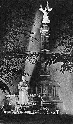 The rise of fascism in particular frequently encouraged greater state involvement. In Italy, between the end of the war and 1923 local groups and organisations had established their own local memorials in villages and towns.[76] Not all villages agreed that memorials were appropriate, either for political or religious reasons.[77] With the Fascist revolution, this process became more centralised; veteran groups were assimilated by the Fascist government in 1926, and a systematic attempt to construct suitable national and local memorials followed.[77] In Germany, the political and economic chaos of the immediate post-war years discouraged the construction of civic war memorials and comparatively few civic memorials in their larger towns, mainly due to the shortage of funds in the inter-war German economy and political disagreements between local groups as to what to commemorate and how.[78] Those memorials that were constructed were often built instead by local movements, representing particular factional interests.[79] It was only after the rise of the German Nazi party to power in 1933 that substantial funding began to flow into construction programmes, controlled from Berlin.[80]
