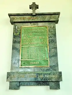 In Britain and Australia, early memorials were closely linked to the need to promote military recruitment and the state had an ambivalent attitude towards the informal memorials that emerged during the conflict. In Britain, stone memorials to the war began to be erected in towns and villages from 1915 onwards; some of these were given out by the state as rewards to communities for meeting military recruitment targets.[36] In Australia, the existing memorials to mark the Boer War were used initially for commemorative ceremonies intended to increase military recruitment.[37] As casualties increased, rolls of honour listing the dead began to be displayed in Britain and honour tablets with the names of those who had enlisted were put up inside Australian buildings: Australia used these lists to apply moral pressure on those who were not yet joined up.[38] Informal memorials began to multiply as the war progressed. Local Australian groups erected small monuments, such as drinking fountains and stone pillars, to the point where the government became concerned about the expenditure on them and passed a law in 1916 to control their numbers.[39] In Britain, some Anglican church leaders began to create street war shrines to the dead. These cheap, local memorials were mainly constructed in working class districts, often built from wood and paper, and were used for holding short services in honour of the dead and to hold donations of flowers.[40] They were criticised, however, as promoting Catholic ritualism.[40] Official support for the shrines only came after a national newspaper campaign, efforts by the Lord Mayor of London and a well-publicised visit from Queen Mary to a shrine, and standardised stone shrines then began to replace the earlier, temporary versions.[41]