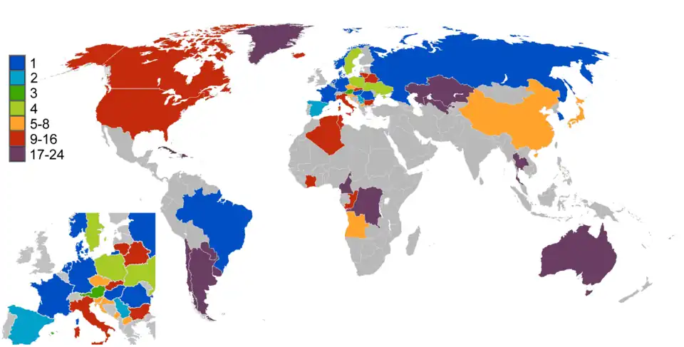 - ^ Russia's total includes one appearance as Russian Handball Federation in 2021.