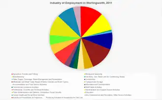 In 2011, the occupations of the villagers was almost equally mixed between employment sectors. The biggest employing sector was Wholesale and Retail Trade which employed 52 people. The second largest sector was Agriculture, Forestry and Fishing which employed 47 people, this includes L.E Tuckwell Ltd. who is an agricultural supplier and a major employer within Worlingworth.[18][11]