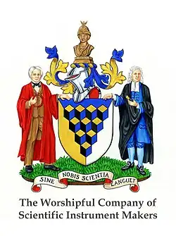 The coat of arms[5] includes two key figures from the area of scientific instrument making, Sir Isaac Newton and Michael Faraday. The crest is Minerva the Roman Goddess of wisdom and strategic warfare. It is featured in a stained glass window[6] in the Company church St Margaret Lothbury.[7]
