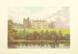 Worsley New Hall was an Elizabethan Gothic-style mansion, faced with Hollington stone. The Hall was three stories high and had a symmetrical main block, with a wing for the family on one side and a servant wing and a tower on the other side.[1] The plans are held at the Victoria and Albert Museum.[5]