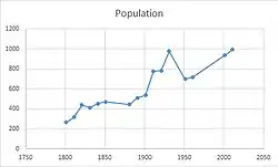 The village of Worth covers an area of 1,629 hectares and, with a population of 992, it has a population density of 0.61 people per hectare.[11] In 1801, the village had a population of 264 people, which rose to 718 by 1961.[12] The population peaked at 977 in 1931 and,[13] after a drop, it climbed above the 977 mark in the 2011 census.[14]