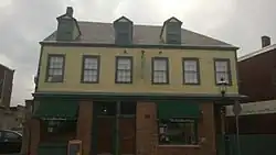 The building is triangular in shape, with the back of the building reduced to a point and an entrance door located at another streetside point. A center front-facing door previously led to the upper floor but now opens at the bar. During Prohibition the premises were still in use as a tavern, though local ownership records from 1924–1933 show it was a "restaurant" serving "beverages" and "soft drinks".[1] A secret panel behind the bar and above a built-in ice box reveals a hiding place for various bottles of spirits.[1]