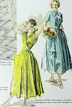 During the Great Depression, house dresses called "Hooverettes" were popular which employed a wrap design. Wrap dresses were designed by Elsa Schiaparelli in the 1930s[8][9] and by Claire McCardell in the 1940s, whose original 'popover' design, which was made out of denim, became the basis for a variety of wrap-around dresses.[10]: 105 [11] Fashion designer Charles James also designed a wrap dress.[12]