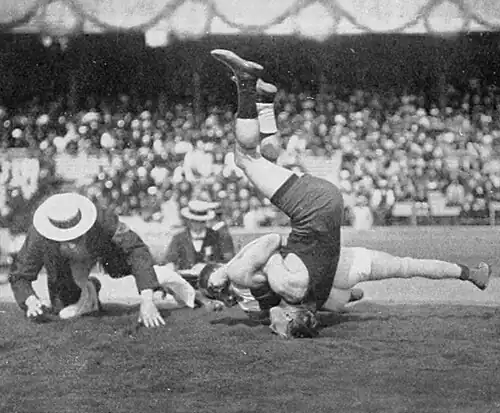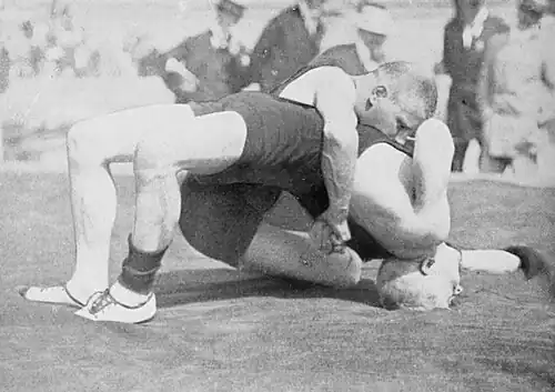 The competition used a form of double-elimination tournament. Rather than using the brackets that are now standard for double-elimination contests (and which assure that each match is between two competitors with the same number of losses), each wrestler drew a number. Each man would face off against the wrestler with the next number, provided he had not already faced that wrestler and that the wrestler was not from the same nation as him (unless this was necessary to avoid byes).