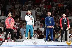 ![]() Medalists Daichi Takatani, Razambek Zhamalov, Kyle Dake, and Chermen Valiev stand on the podium at the award ceremony | |||||||||||||||||