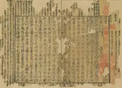 According to the Xinlun (新論), as known as New Discussion, by Huan Tan, a different definition is given to the five blessings. Xinlun suggested that the meaning of five blessings are "longevity" (; shou), "wealth" (; fu), "prosperity in government" (; kuei), "health" (安樂; an le) and "fertility" (子孫眾多; tzu-sun chung-tuo) accordingly.[5] The meaning of "fertility and fecundity" in the definition of Xinlun still implies the original meaning of "long span of life" and "peaceful death" (kan zhong ming and shou) in the Book of Documents. However, the meaning of "kuei" refers to the "allotment and mandate of one’s share in government position and society," not the meaning of "love of virtue" mentioned in Book of Documents.[1]