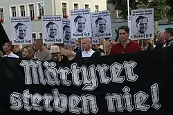 The town decided to have the Hess grave removed in 2011. The family of Rudolf Hess arranged with the cemetery to have Hess’s remains exhumed, cremated and scattered at sea to deter any further pilgrimages to his grave. The gravestone with the words "Ich hab's gewagt" ('I have dared') was removed and destroyed.[3] Smaller neo-Nazi marches continued afterward, leading the human-rights group Rechts gegen Rechts to organise a charity drive whereby a certain sum of money would be donated to the organisation Exit Deutschland, which helps neo-Nazis leave the movement, for each meter marched.[4]