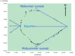 A series of stones, located to the west of the arrangement's western apex, mark the positions of the setting sun at the equinoxes and solstices.[10] A survey study shows that these alignments are accurate to within a few degrees. Additionally, the straight sides of the arrangement, which diverge from its eastern apex, also indicate the setting position of the sun at the solstices to within a few degrees. At the equinoxes, the sun sets over the three prominent stones at its apex.[3]