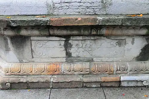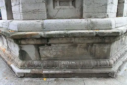 The pagoda has eight sides and seven storeys, with four of the storeys including carvings of Buddhist figures carved in small niches.[7] It is 11.25 meters tall, with a diameter of 4.25 meters at the "Sumeru Throne" (須彌座 xūmízuò) style base.[2][3]
