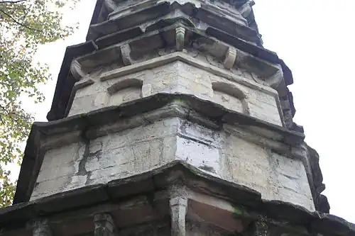 The original pagoda having been destroyed at some earlier time, it was rebuilt in 1270 (咸淳六年) in the throes of the overthrow of the Southern Song during the reign of Emperor Duzong.[4] The pagoda bears inscriptions dating from the period.[2] The pagoda was designed to incorporate Buddhist iconography through various symbolic features and figures[5] including images of Buddha, bodhisattvas, heavenly kings and celestial guards. While of solid stone construction, it is modeled upon multi-storeyed wooden pagodas.[2] Some of the original artistry has been damaged.