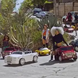 The video consists of title cards bluntly detailing the improvised production of each scene.[25][30] Originally, Staake wanted the video to be of Young Thug lighting the $100,000 budget on fire,[26] but Young Thug's record label was concerned with potential legal consequences.[27] An audio recording of Young Thug's conversation with John Colombo, who was originally slated to direct the music video, was sent to Staake. The audio, in which the two discussed ideas for the video, was ultimately included in the music video.[26] The music video consists of children dressed in police uniforms destroying police cars, models driving toy cars, and police threatening to shut down production. Young Thug's only appearance in the music video is a brief, self-directed clip of him eating Cheetos, which was sent to Staake two months after the video's shooting.[32]