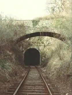 Construction was started at Tintern on 26 May 1874, the contractor Reid Brothers and Co having undertaken to complete the line by December 1875.[17] The technical aspects of the construction were difficult, especially at the southern end of the route. There were two tunnels; the longer was Tidenham (or Denhill) tunnel. When completed it was 1,188 yards (1,086 m) in length (having been planned at 715 yards (654 m)). The actual construction cost of the line was £318,000, the greater part of the expenditure being on the tunnel.[1]