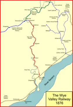The Wye Valley Railway was a standard gauge railway that ran for nearly 15 miles (24 km) along the Lower Wye Valley between the towns of Chepstow and Monmouth, crossing several times between Wales and England. Opened on 1 November 1876, it was leased to, and worked by, the Great Western Railway (GWR), before being fully absorbed by the GWR in 1905.