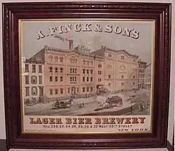 In 1886, the mansion and land was sold by the executors of the will of Elizabeth S. Jones to Andrew Finck (1829-1890) for $25,000.[5] Wyndcliffe was later known as Linden Hall or Finck Castle, for those subsequent owners. Andrew Finck was a New York City brewer whose son August Finck (1854-1905) and grandson August Finck Jr. (1879-1915) operated one of the larger breweries in New York City. A. Finck & Son's Brewery, 320-332 W. 39th St, Manhattan, NYC, produced Enterprise, a light lager beer from 1870 to 1911. Andrew Finck's nephew, John Henry Finck (1843-1881) operated a prosperous Feed and Flour business at 600 N. 11th Ave, Manhattan, NYC.
