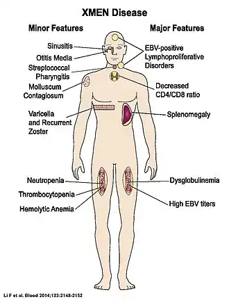 - ^ a b c d e Li FY, Chaigne-Delalande B, Su H, Uzel G, Matthews H, Lenardo MJ (April 2014). "XMEN disease: a new primary immunodeficiency affecting Mg2+ regulation of immunity against Epstein-Barr virus". Blood. 123 (14): 2148–52. doi:10.1182/blood-2013-11-538686. PMC 3975255. PMID 24550228.