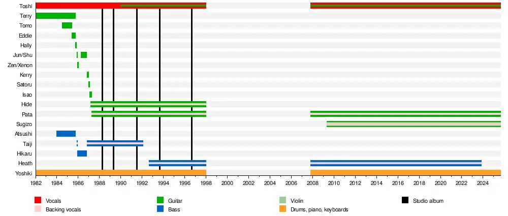 - Yoshiki – drums, piano, keyboards[125] (1982–1997, 2007–2018)