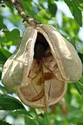It is a large deciduous shrub or small tree growing to 8 m tall. The leaves are arranged alternately, 12–30 cm long, and are pinnate, with 9–17 leaflets, the leaflets 3–6 cm long, with a sharply serrated margin.[8] The flowers are 2–3 cm in diameter, with five white petals, and are produced in erect panicles 10–20 cm long in mid spring. The fruit is an oval leathery capsule 5–6 cm diameter, which splits into three sections at maturity to release the 6–18 seeds; the seeds are black, 1.5 cm in diameter, resembling a small horse chestnut seed.[9][10] The shells of the fruits and seeds are very hard, so that they are best protected during the growth process.[5] Generally, X. sorbifolium only blooms white flowers. In the process of multiple crosses performed by the '西北文冠果基地/Northwest X. sorbifolium base' ("using 56 seeds of X.sorbifolium from all over the country to make them natural hybrids, in order to increase fruit yield"), unexpectedly, the flower color also changed from single to multiple.[5]
