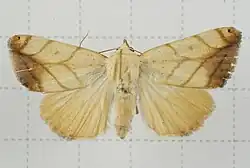 The wingspan of the female is 36 mm and male is 35–42 mm.[4] Palpi reddish brown and porrect (extending forward). Head, thorax and abdomen bright canary yellow. Vertex of thorax rufous. Legs reddish brown. Tibia with long hairs.[3] Forewings bright yellowish with distinct three brown arrow-shaped lines across each forewing. The caterpillars show remarkable color variations. A large bright rufous triangular patch is found over the whole outer area of the forewings. A black sub-apical speck visible. Cilia rufous. Hindwings reddish brown suffusion with rufous outer margin. The caterpillar is 35–40 mm in length.