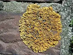 The etymology of the current name is rooted in its appearance and habitat. Xanthoria derives from the Greek xănthós, meaning 'yellow', with the generic suffix oria ("pertaining to"), and alludes to the lichen's bright orange-yellow color.[29] The species epithet parietina comes from Latin parietina ('of walls'), referring to its frequent occurrence on walls. Thus, the name Xanthoria parietina essentially means "yellow wall (lichen)", a fitting description of this common orange lichen, and one of its several English common names.[30] Other common names used for this species include "common orange lichen", "yellow scales",[31] "maritime sunburst lichen", "wall lichen",[32] and "shore lichen".[33][34]