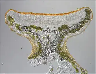 The vegetative body of the lichen, the thallus, is foliose (leafy) and typically less than 8 centimetres (3.1 in) wide. The lobes of the thallus are 1–4 mm (rarely up to 7 mm) in diameter, and flattened,[35] though in African populations the lobes tend to be smaller than those in temperate areas, typically 0.5–2.0 mm wide.[36] The upper surface is some shade of yellow, orange, or greenish yellow, becoming almost green when growing in shaded situations. The lower surface is white, has a cortex, and sparse pale rhizines or hapters that help attach the thallus to its substrate. The vegetative reproductive structures soredia and isidia are absent in this species.[35] X. parietina reproduces primarily through sexual reproduction via apothecia (fruiting bodies). Apothecia typically develop about 2–4 mm behind the growing edge of the thallus and take 12–18 months to reach maturity. Mature apothecia typically measure between 1.5 and 2.6 mm in diameter, though in rare cases they can reach up to 4.3 mm. They can comprise between 0–87% of a thallus's dry weight, with most thalli dedicating 10–30% of their biomass to these reproductive structures. The apothecia can release spores at rates of up to 50 per minute under humid conditions. The production of apothecia appears to be independent of the thallus's directional aspect (north, south, east, or west facing), meaning that sunlight exposure does not significantly influence reproductive effort.[37]