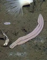 Xenoturbella profunda individuals were sampled at ca. 3,700 m (12,100 ft) depth near a carbonate-hosted hydrothermal vent in the Gulf of California.[8] This animal is 15 cm (5.9 in) in length, with a uniform pale pink colouration. The body wall displays several furrows: on the circumference, on the side, and two deep, longitudinal, dorsal ones. The longitudinal orientation involves a rounded anterior end, while the posterior end gradually reduces in thickness. The mouth is orientated ventrally, anterior to the ring furrow. The live specimens exhibited an epidermal ventral glandular network branching over two-thirds of the ventral surface. The species is gonochoric, and gametes are present dorsally and ventrally in the body wall.[1] Tissues contain exogenous DNA corresponding to a bivalve mollusk, the vesicomyid Archivesica gigas.[1]