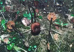 Morphologically, the dark colour of the gills and stem, lack of a strong taste, and characters of the cystidia (large cells found on the mushrooms) are the most distinguishing characteristics of X. setulipes.[2] These features allow the species to be readily distinguished from other, similar species, including X. cauticinalis and X. brunneola. Its ecology and habitat are also distinct, but it is unclear whether they can serve as certain identifying characteristics. Within the genus Xeromphalina, X. setulipes is classified in the section Mutabiles, along with several other species. It seems most closely related to X. fraxinophila, X. cornui, X. campanelloides and X. cauticinalis, but, according to Esteve-Raventós and colleagues, further analysis is required to accurately judge the relationships between the species of Xeromphalina.