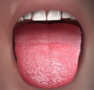 - Fissured tongue with atrophy of the filiform papillae and a lobulated, erythematous appearance of the tongue.[1][9]